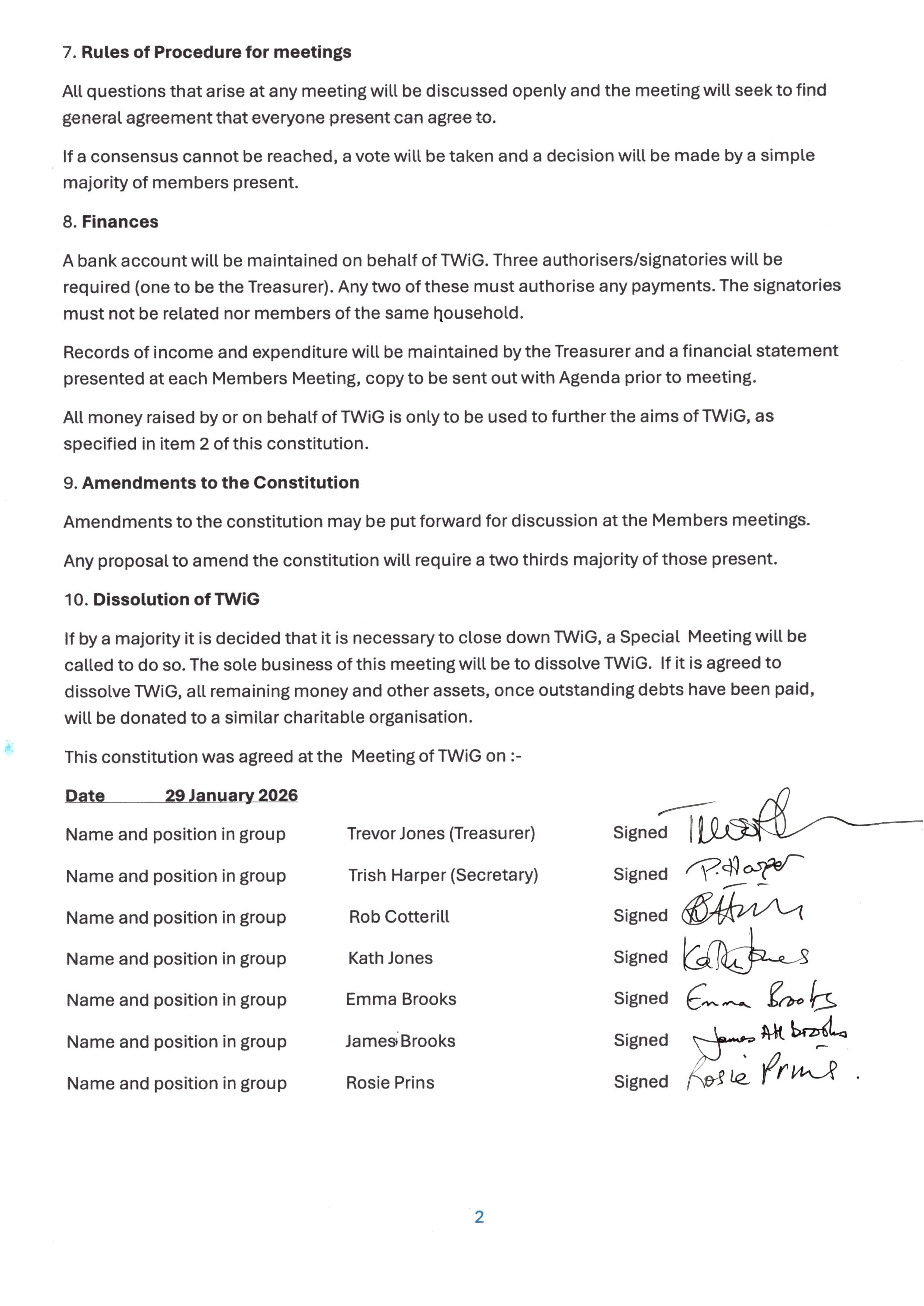 At a member meeting on the 29th Jan 2026, the Constitution of TWiG was written and ratified by all present. The ‘Terms of Reference’ provide further detail.